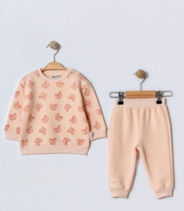 Miniworld طقم طفلة باللون الخوخي برسمة فراشات من